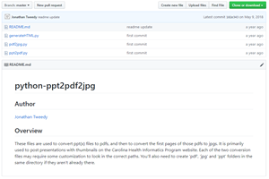 Python PPT to PDF to JPG Conversion Scripts: These files are used to convert ppt(x) files to pdfs, and then to convert the first pages of those pdfs to jpgs. It is primarily used to post presentations with thumbnails on the Carolina Health Informatics Program website. Each of the two conversion files may require some customization to look in the correct paths. You'll also need to create 'pdf', 'jpg' and 'ppt' folders in the same directory if they aren't already there.