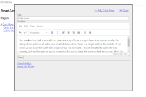 ReadActive: Interactive Story Builder: Under Construction! Remember those 'Choose Your Own Adventure' stories? This tool allows users to build those kinds of interactive stories and share them with others to read. A fun way to practice reading and thinking in another language, this tool will eventually also feature vocabulary lists and flashcard deck generation capabilities. The project is written in Python, hosted on AWS Elastic Beanstalk, and stores its data on an AWS DynamoDB instance.